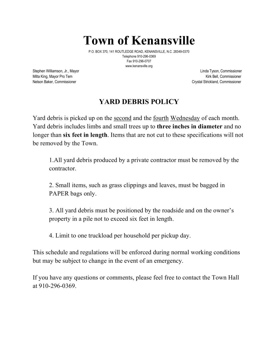 Please refer to our Yard Debris Policy by clicking on the following link: Town of Kenansville's Yard Debris Policy